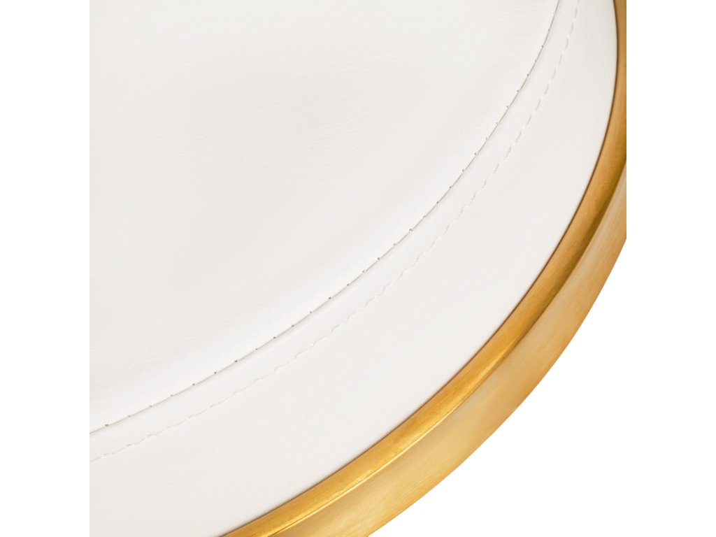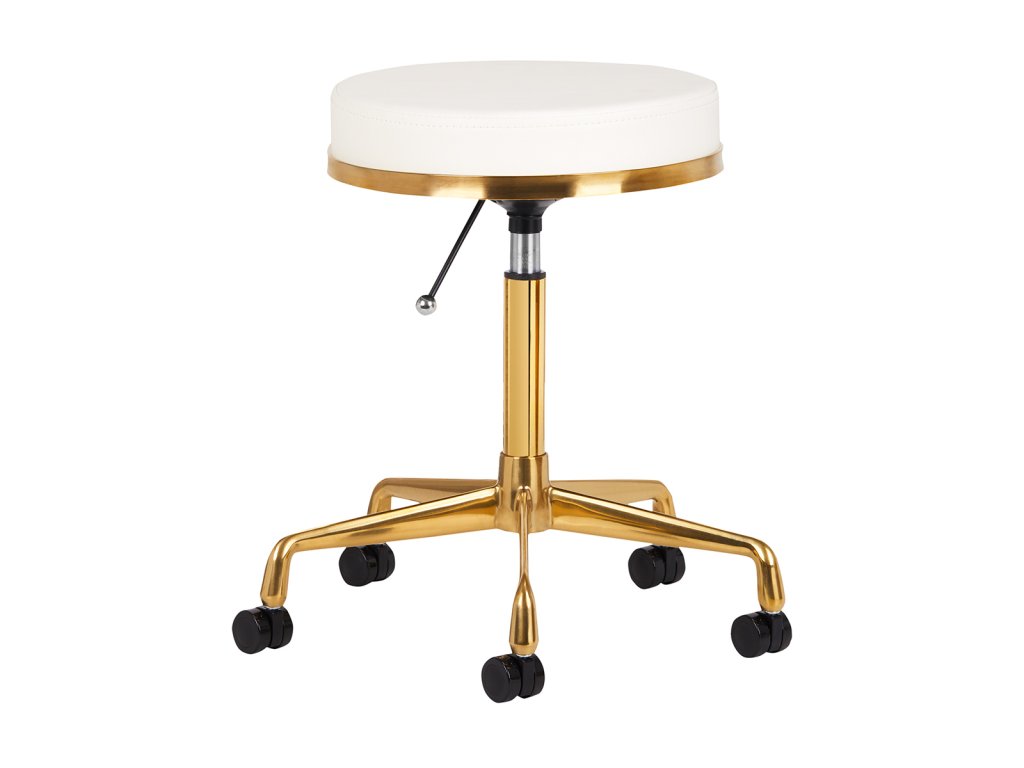 Jedinečná kozmetická stolička v bielej farbe s prešívaným sedákom a kovovou povrchovou úpravou v zlatej farbe. Je výškovo nastaviteľný a má základňu prítlačného ramena vybavenú pevnými kolieskami.