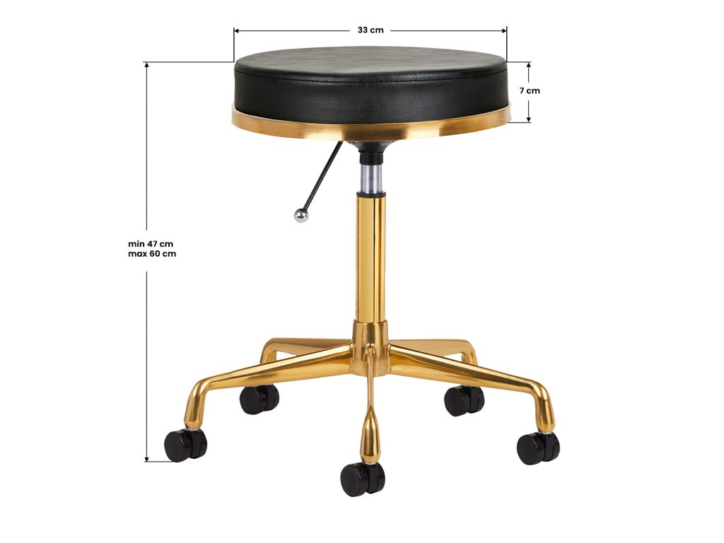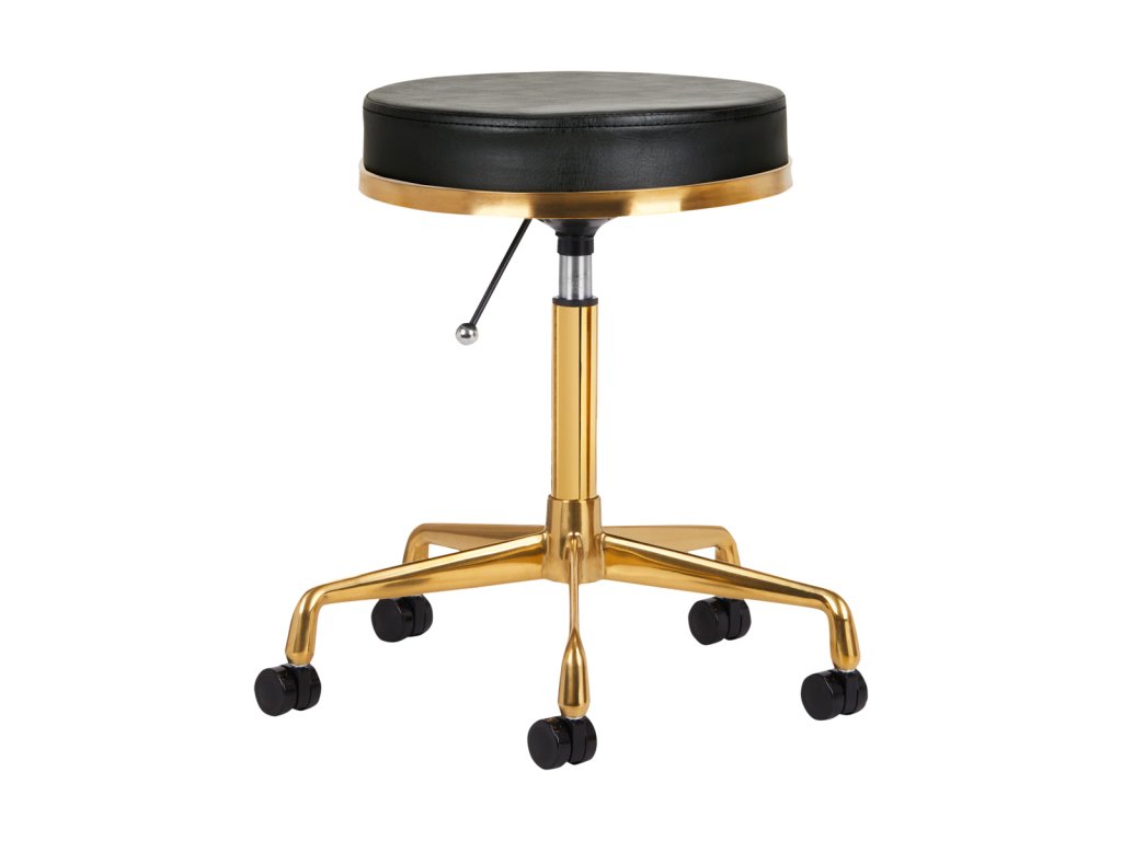 Jedinečná kozmetická stolička v čiernej farbe s prešívaným sedákom a kovovým povrchom v zlatej farbe. Je výškovo nastaviteľný a má základňu prítlačného ramena vybavenú pevnými kolieskami.
