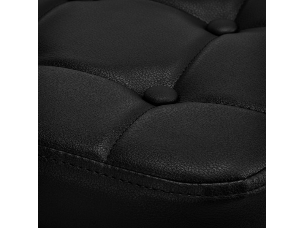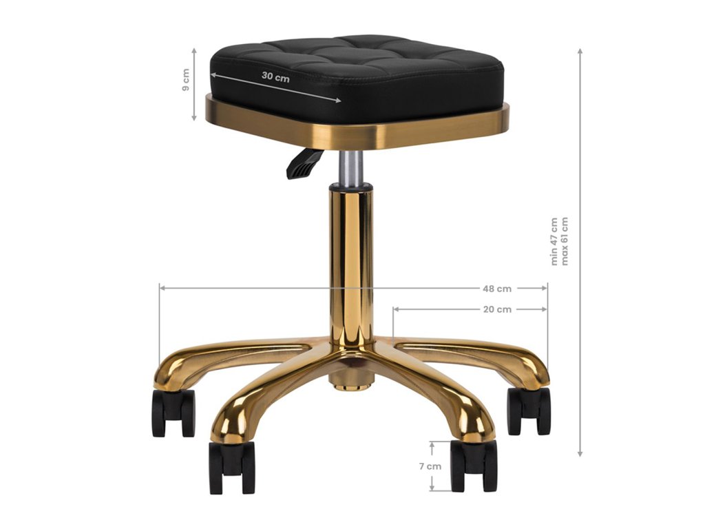 Jedinečný kozmetický taburet v čiernej farbe s prešívaným sedákom a kovovým povrchom v zlatej farbe. Je výškovo nastaviteľný a má základňu prítlačného ramena vybavenú pevnými kolieskami.