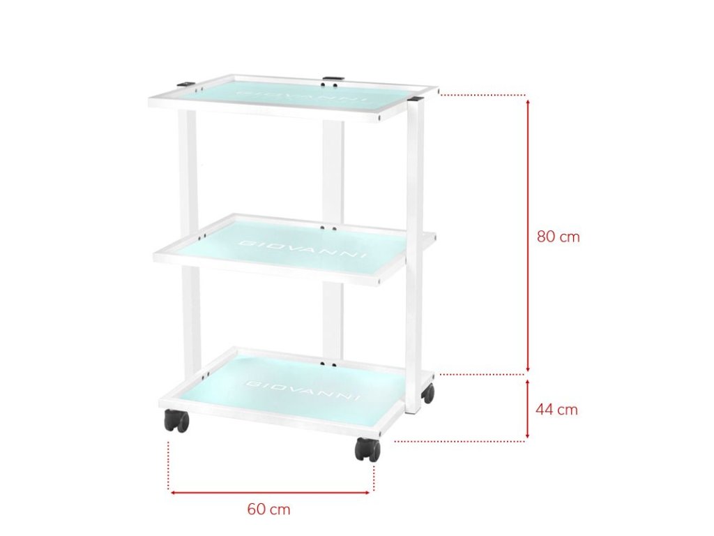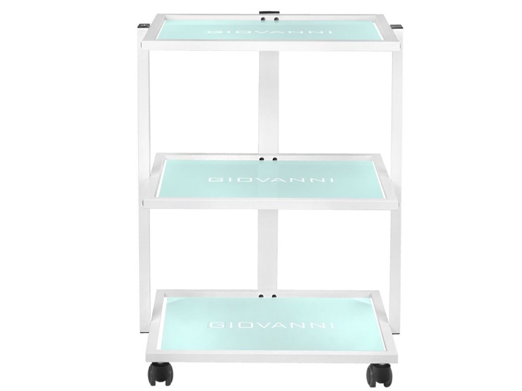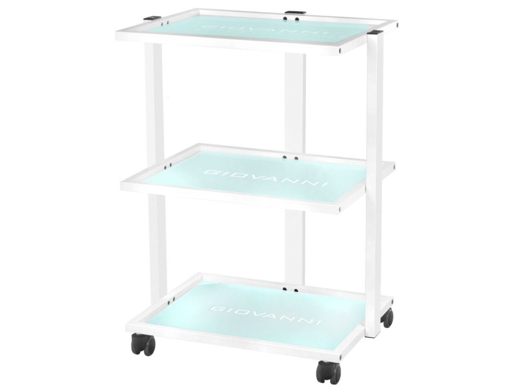 s pogumovanými kolieskami. Má tri sklenené police s vyrytým logom GIOVANNI. Je možné k nemu pripevniť zväčšovaciu lampu.