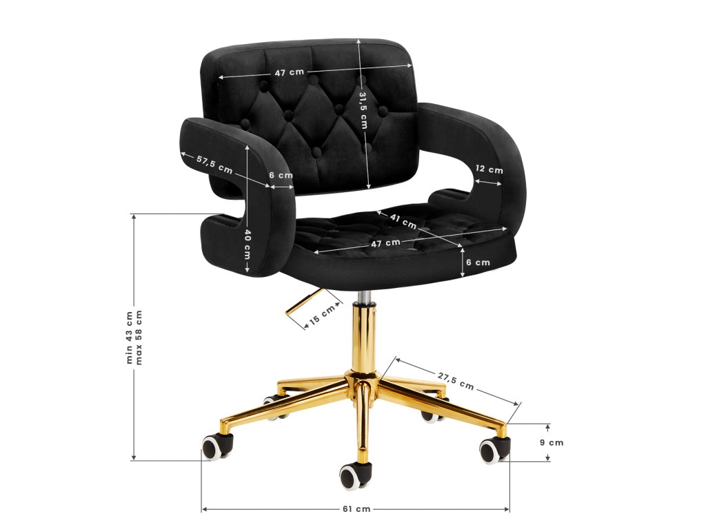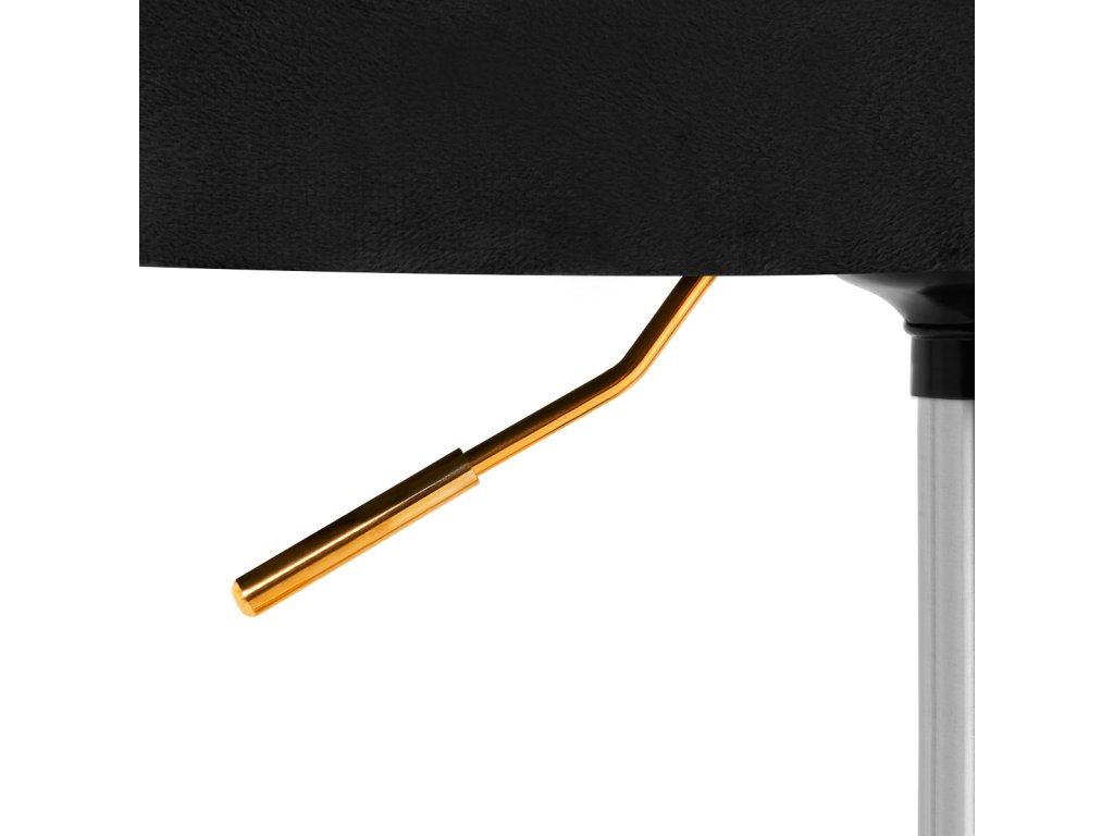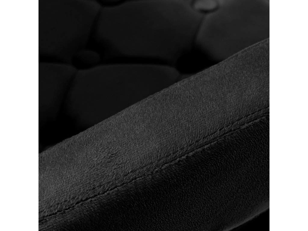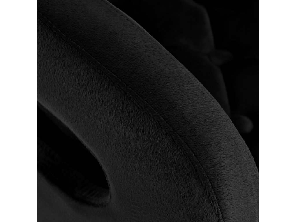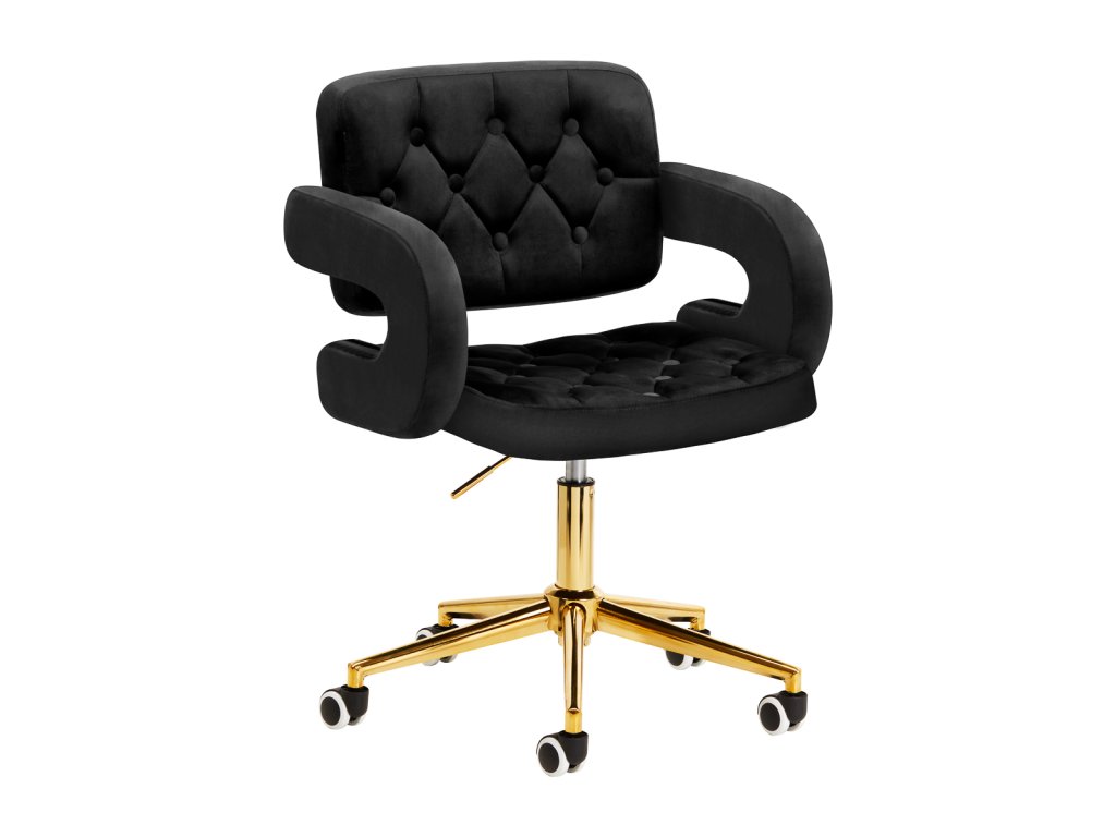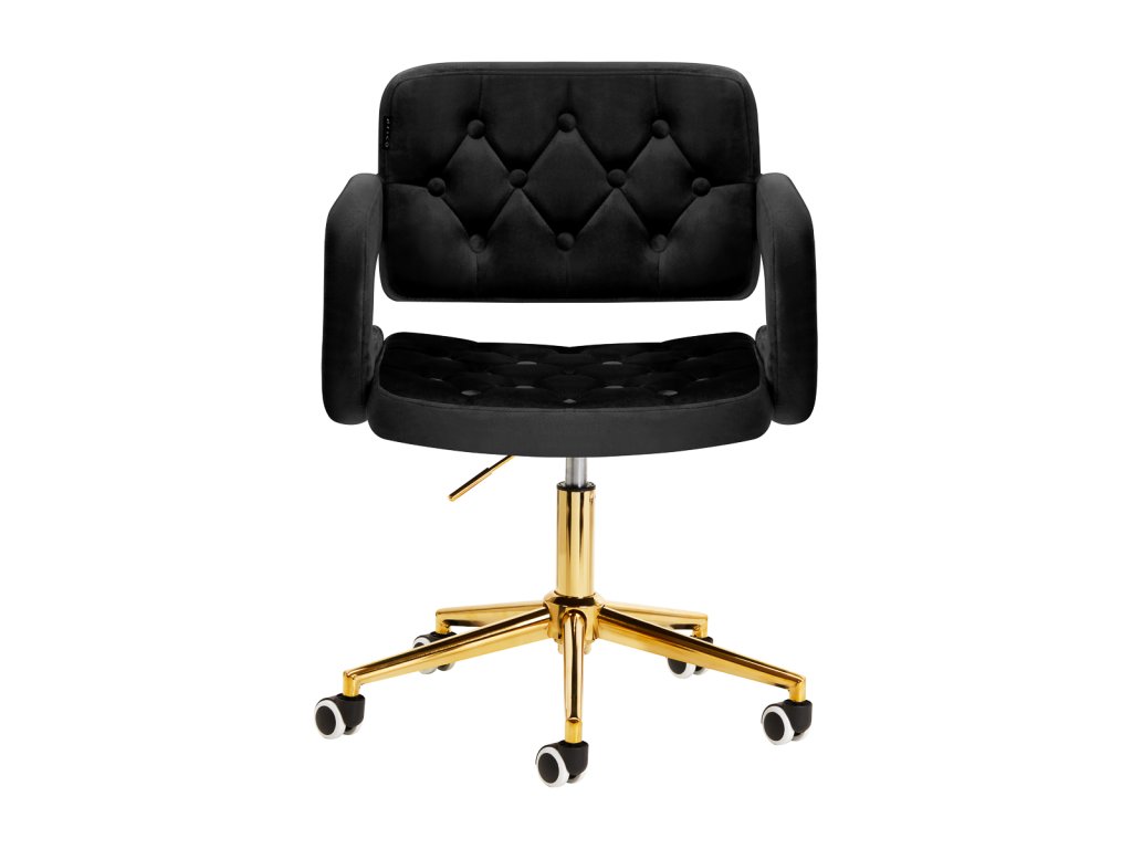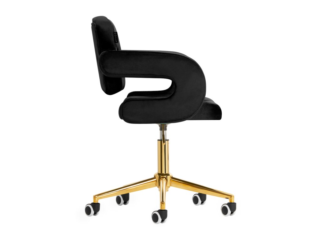 Na dotyk príjemné zamatové čalúnenie v odtieňoch čiernej farby dodáva nábytku jedinečný charakter. Vďaka povrchovej úprave je nábytok pútavý. Rám v zlatých odtieňoch dodáva eleganciu a dokonale ladí so zamatom. Funkčné kolieska za isťujú mobilitu, vďaka čomu sa kreslo dá ľahko premiestňovať a pohybovať sa po obývacej izbe počas práce. Estetika spracovania, komfort používania, ozdobné prešívanie a ergonomicky profilované operadlo predurčujú kreslo na splnenie požiadaviek aj tých najnáročnejších používateľov.