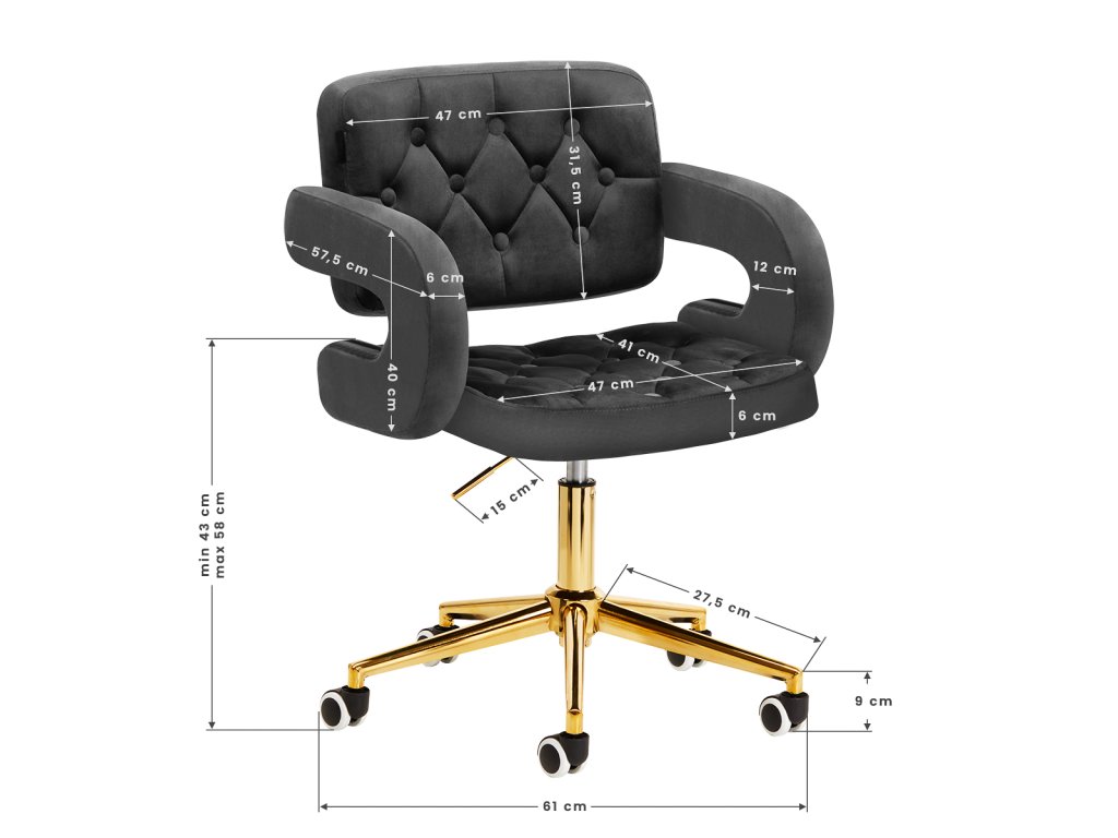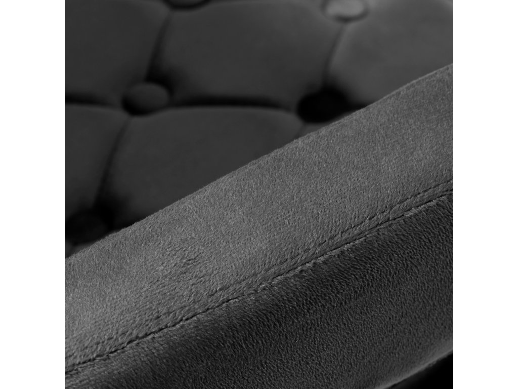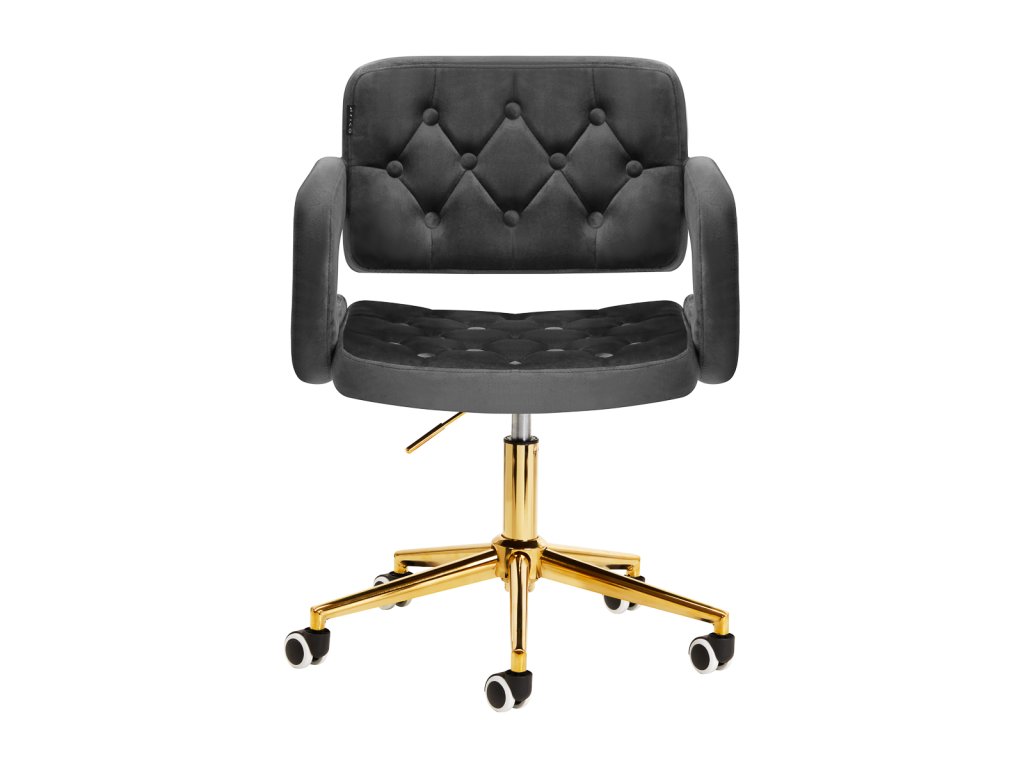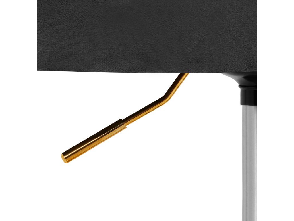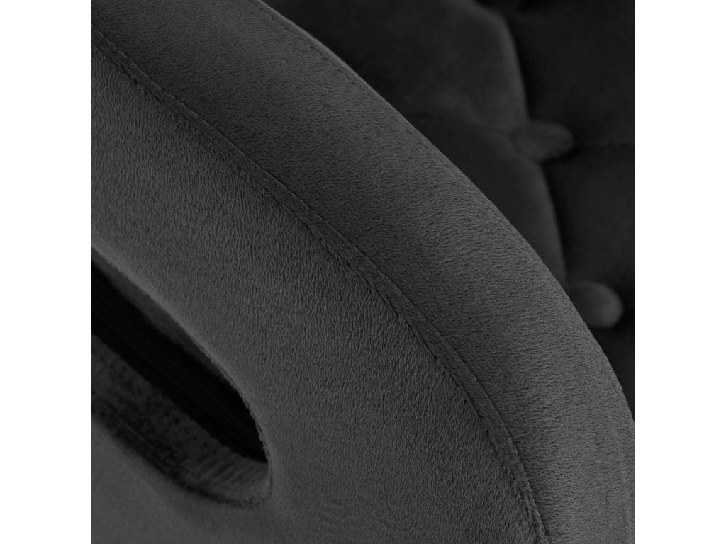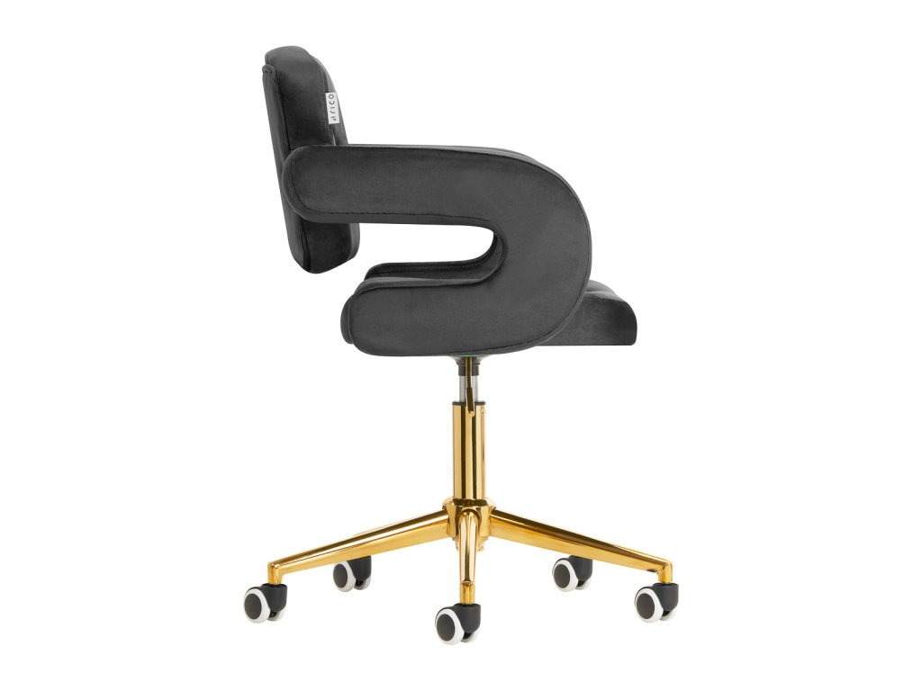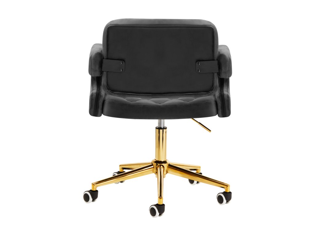 Na dotyk príjemné zamatové čalúnenie v odtieňoch čiernej farby dodáva nábytku jedinečný charakter. Vďaka povrchovej úprave je nábytok pútavý. Rám v zlatých odtieňoch dodáva eleganciu a dokonale ladí so zamatom. Funkčné kolieska za isťujú mobilitu, vďaka čomu sa kreslo dá ľahko premiestňovať a pohybovať sa po obývacej izbe počas práce. Estetika spracovania, komfort používania, ozdobné prešívanie a ergonomicky profilované operadlo predurčujú kreslo na splnenie požiadaviek aj tých najnáročnejších používateľov.