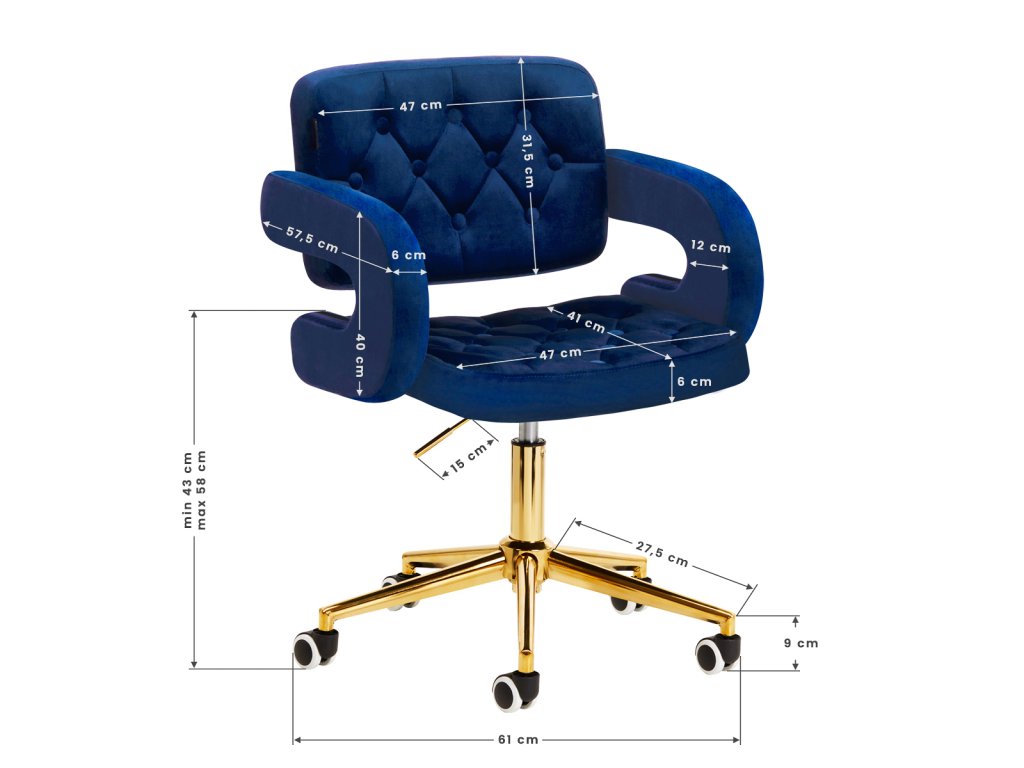 Na dotyk príjemné zamatové čalúnenie v odtieňoch čiernej farby dodáva nábytku jedinečný charakter. Vďaka povrchovej úprave je nábytok pútavý. Rám v zlatých odtieňoch dodáva eleganciu a dokonale ladí so zamatom. Funkčné kolieska za isťujú mobilitu, vďaka čomu sa kreslo dá ľahko premiestňovať a pohybovať sa po obývacej izbe počas práce. Estetika spracovania, komfort používania, ozdobné prešívanie a ergonomicky profilované operadlo predurčujú kreslo na splnenie požiadaviek aj tých najnáročnejších používateľov.