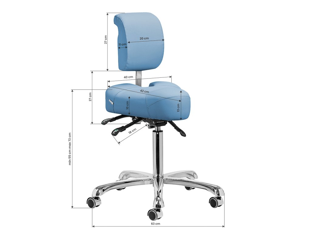 Nastavenie výšky od 55 do 72 cm vám umožní vhodne sa polohovať pri vykonávaní služieb. Dokonale profilované nastaviteľné operadlo poskytuje optimálnu bedrovú oporu a minimalizuje únavu pri dlhodobej práci. Mechanizmus úplného otáčania umožňuje efektívnejšiu a pohodlnejšiu prácu. Stolička má aj funkciu uzamykateľnej kolísky , ktorá umožňuje ergonomické polohovanie tela. Sedadlo je nastaviteľné v sklone a výške vďaka plynovým vzperám. Okrem toho je možné manuálne nastaviť výšku operadla pre úplné pohodlie počas používania.