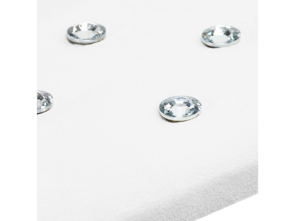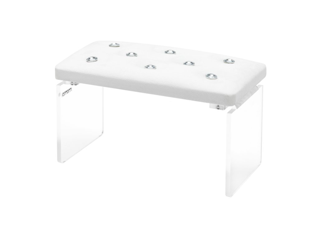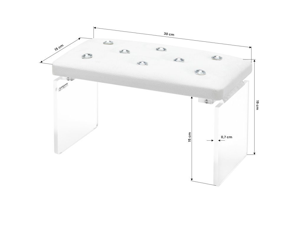 Vhodná výška podpery zaisťuje pohodlnú polohu pre klienta aj stylistu. Správna poloha stylistu minimalizuje zaťaženie chrbtice, čím účinne znižuje bolesti chrbta a poskytuje klientovi väčšie pohodlie a relaxáciu. Silikónové prvky na nohách chránia dosku stola pred poškriabaním a zabraňujú jej posúvaniu po stole, čím zabezpečujú stabilitu. Plastový rám a elegantný zamat zabezpečujú dlhú životnosť výrobku a ozdobné kryštály mu dodávajú jedinečný vzhľad.