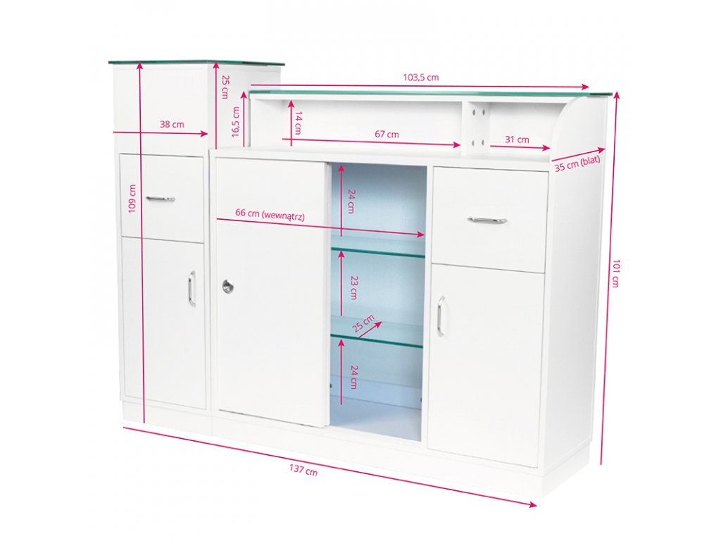 Vieme veľmi dobre, aký dôležitý je prvý dojem. Stojí za to sa o nich postarať a zaistiť, aby každý náš nový klient pocítil atmosféru luxusu. Predstavíme novú recepciu pre značku Gabbiano. Nábytok je vyrobený z najkvalitnejších materiálov a je dokonale opracovaný. Skriňa, zásuvka a početné police vo vnútornej časti recepcie vám umožnia udržiavať poriadok na najdôležitejšom mieste každého salónu.