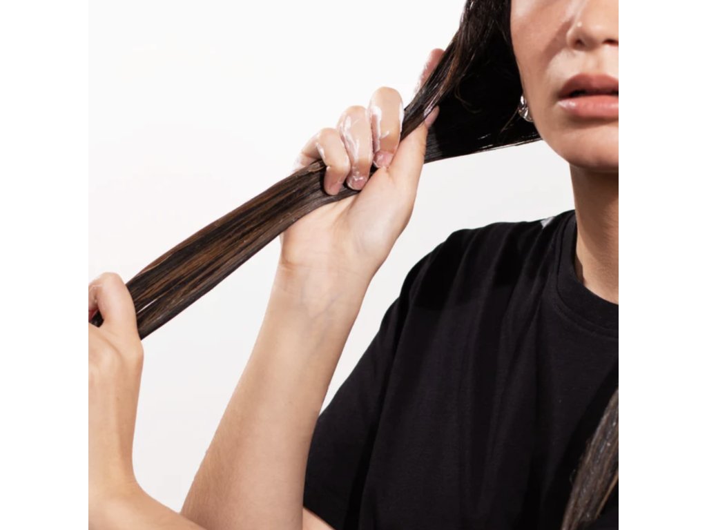 - 2. Naneste Hydratační masku na vlasy+ na ručníkem vysušené vlasy od poloviny délky ke konečkům a ujistěte se, že jsou vlasy zcela nasycené a že nejsou zakryty kořínky.