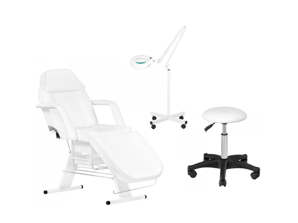 Štartovacia sada pre kozmetičky - Polohovateľné kozmetické lehátko + kozmetický taburet + Kozmet. lampa BIELA FARBA