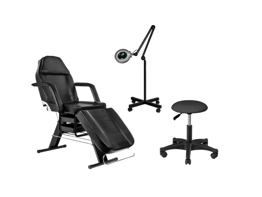 Štartovacia sada pre kozmetičky - Polohovateľné kozmetické lehátko + kozmetický taburet + Kozmet. lampa ČIERNA FARBA