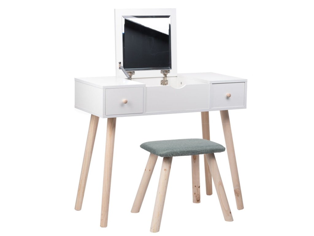 Tá wspaniała toaletka sprawi, że serca kobiet zabiją szybciej. Prosty, skandynawski kształt, dwie szufladki, wygodne lustro ukryte w blacie dopełniają całości. Toaletka posiada również zmyślniezaprojektowany organizer, który pozwala utrzymać idealny porządek. Od teraz masz wszystko pod ręką. Dzięki wygodnemu krzesełku, możesz wygodnie wykonywać codzienny makijaż.Cechy produktu: Toaletka w prostej stylistyce w kolorze białym Dwie szufladki Kwadratowe lustro ukryte w blacie Krzesełko pokryte zielonym zdejmowanym pokrowcem Drewniany organizer w blacie (6 przegródek) Wysoka funkcjonalność.Wymiary:-Szerokość blatu 90cm, -Głębokość bláta 40cm, -Wysokość bláta 77cm, -Wymiary lustra: 32x32cm, -Wysokość całkowita 114cm, -Wymiary wewnętrzne szuflad bocznych: szer: 18,5cm, szer: 18,5cm, zzer: 18,5cm dł: 37cm, gł: 14cm, -Wymiar krzesełka wys: 41cm, szer: 39cm, gł: 30cm, -Wymiary opakowania: 99x49x30cm, Waga: 26kg, Wykonanie - MDFToaletkę wysydziane.